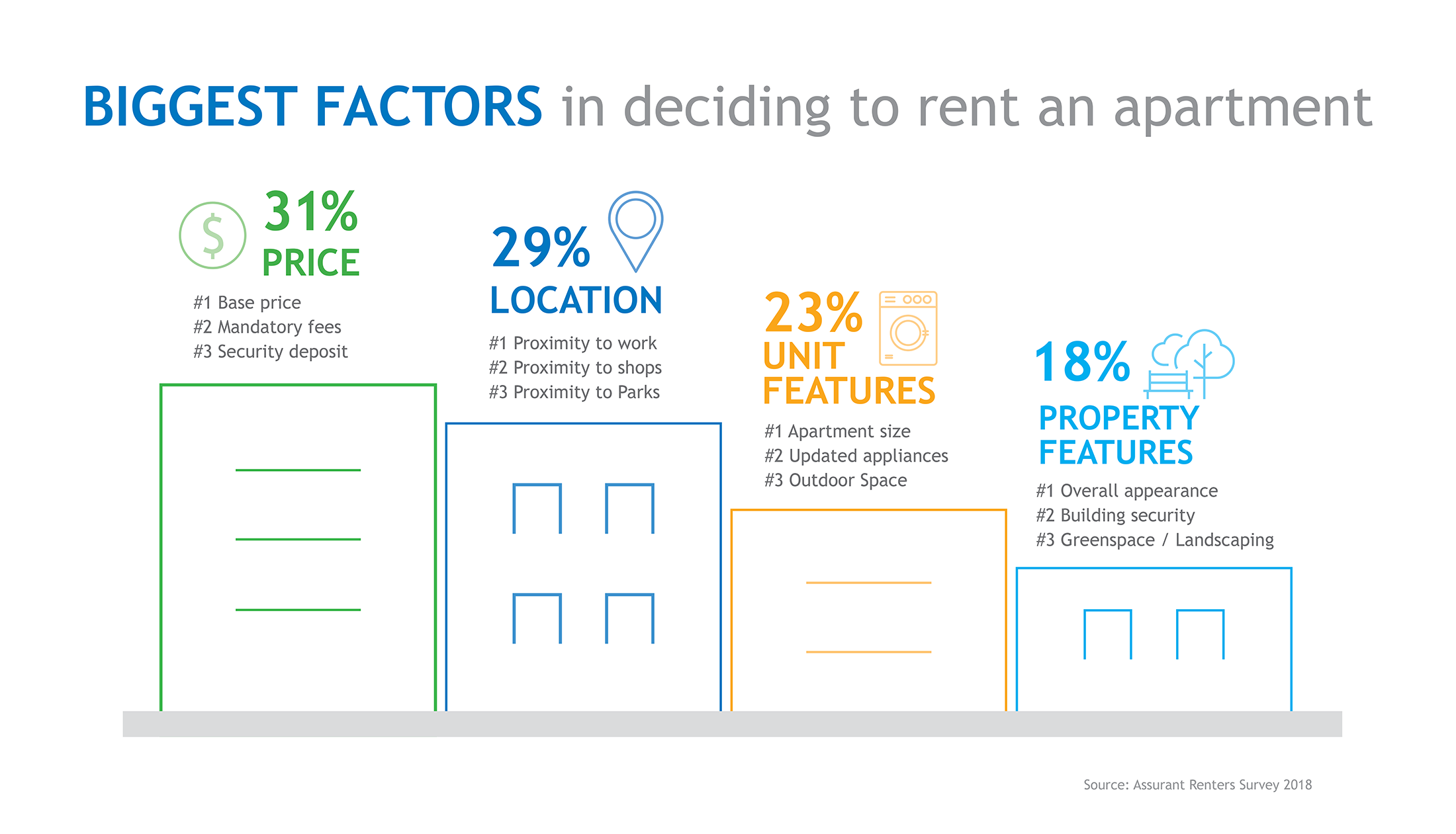 Price is, historically, the make-or-break factor for renters. Not only does it determine if they’ll move in, it also determines if they’ll move out. Finding less expensive alternatives to security deposits or temporarily waiving mandatory fees could be a very appealing offer to prospective residents. Renters we surveyed said the base unit price was the most important consideration when choosing an apartment. But pricey security deposits and mandatory fees also made a big impact on their decision.