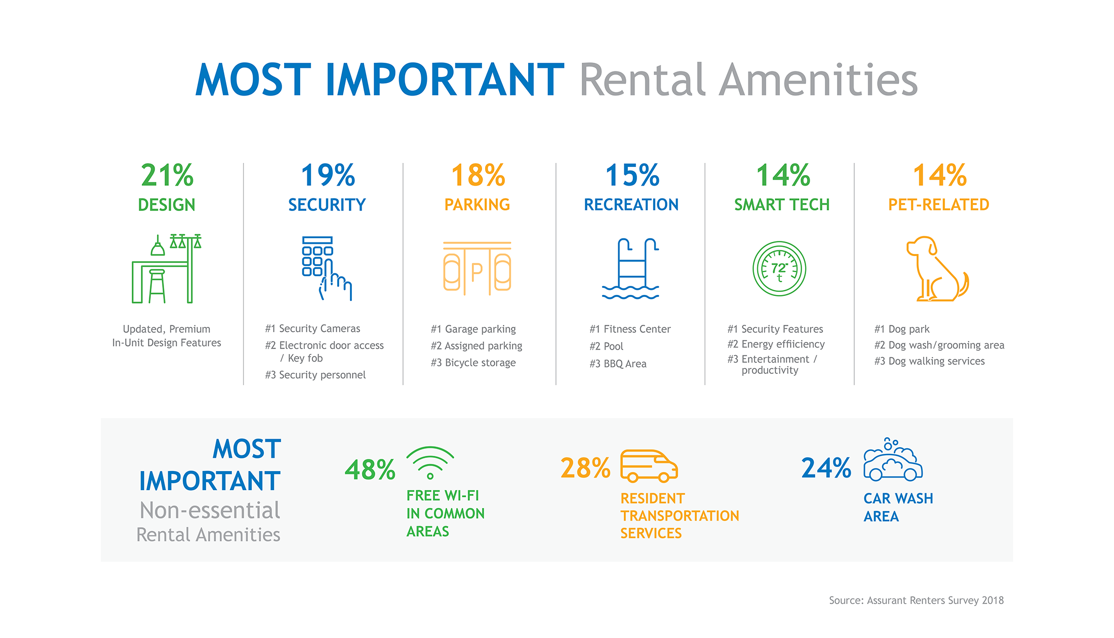 Parking proved to be the third most important feature for renters. Meanwhile, recreational amenities like fitness centers and pools came in fourth. Renters are primarily looking for either garage parking or assigned parking, with only 14% reporting bike storage as their most important parking commodity. And, in fact, additional transportation services even ranked second for the most important nonessential amenity residents want. And a car wash area also made the top three list for important nonessential amenities. So, if you’re looking to develop an empty lot into a fitness center, our survey suggests you might want to reconsider and prioritize parking and transportation.