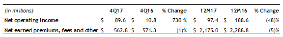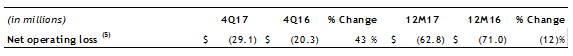 - Net operating loss5 increased in fourth quarter 2017, primarily due to lower net investment income and a $4.6 million charge related to workforce reductions. For the full year, the net operating loss was lower than 2016 reflecting reduced expenses partially from ongoing expense management initiatives.