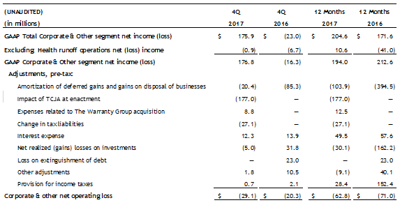 - The company outlook for Corporate & Other full-year net operating loss constitutes forward-looking information and the company believes that it cannot reconcile such forward-looking information to the most comparable GAAP measure without unreasonable efforts. A reconciliation would require the company to quantify amortization of deferred gains and gains on disposal of businesses, interest expense, net realized gains on investments, and change in derivative investment. The last two components cannot be reliably quantified due to the combination of variability and volatility of such components and may, depending on the size of the components, have a significant impact on the reconciliation. The company is able to reasonably quantify a range for the first component for the forecast period, based on certain assumptions relating to future reinsured premium on disposed business during the forecast period. In addition, the company is assuming it does not incur additional debt or extinguish debt in the forecast period. Amortization of deferred gains and gains on disposal of businesses is expected to be approximately $42-50 million after-tax while interest expense is expected to be approximately $42-44 million after-tax. This reflects the lower effective tax rate. In addition, the company is assuming it will refinance $350M of debt maturing in March 2018 but will not incur additional debt in the forecast period.