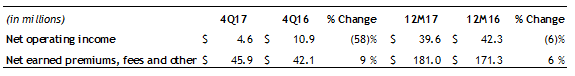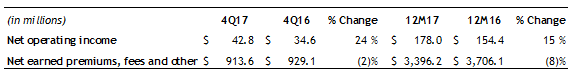 - Net earned premiums, fees and other income increased in the fourth quarter and for full-year 2017, primarily driven by growth in Canada and realization of revenue from prior period sales in the U.S. of the Final Need product.