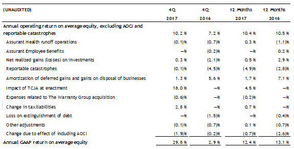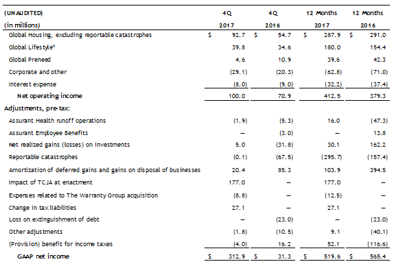 - Net operating income4 decreased to $220.0 million, or $3.98 per diluted share, compared to full-year 2016 net operating income of $276.9 million, or $4.47 per diluted share, primarily due to higher reportable catastrophes and the ongoing lender-placed normalization. The absence of lender-placed regulatory expenses in Global Housing, higher contributions from Global Lifestyle, and lower corporate expenses partially offset the decline. Excluding reportable catastrophes, net operating income for full-year 2017 increased to $412.5 million, or $7.46 per diluted share, compared to $379.3 million, or $6.12 per diluted share in 2016. The absence of lender-placed regulatory expenses in Global Housing, higher contributions from Global Lifestyle, and lower corporate expenses were the main drivers.