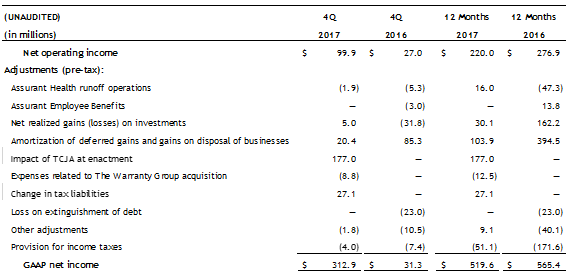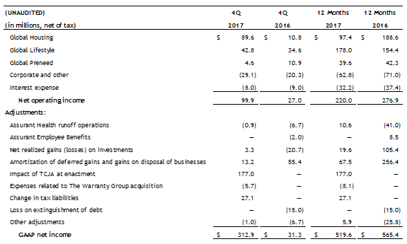 - Net income was $312.9 million, or $5.76 per diluted share, compared to fourth quarter 2016 net income of $31.3 million, or $0.54 per diluted share. The increase was primarily due to a one-time benefit of $177 million from the reduction of net deferred tax liabilities related to the enactment of the U.S. Tax Cuts and Jobs Act, as well as higher contributions from Global Housing, which benefitted from lower reportable catastrophes and the absence of lender-placed regulatory expenses.